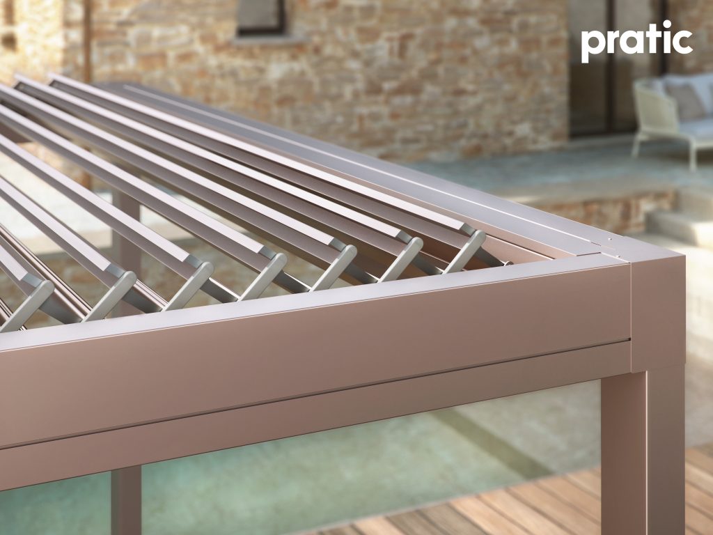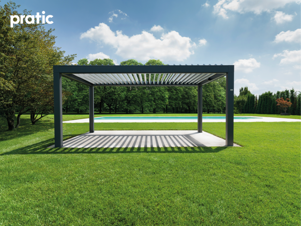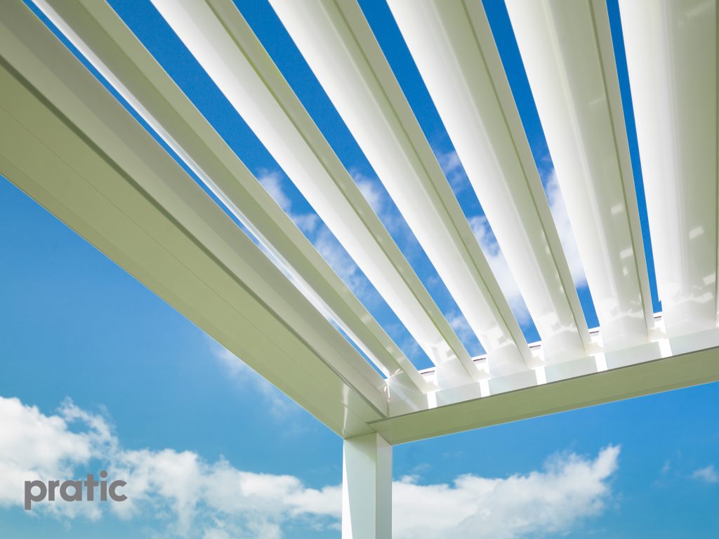 We offer two bioclimatic pergola systems; the first offers a fully retractable canopy while the second is a louvred system which allows both direct and indirect sunlight when open. When closed both systems offer a water tight solution to the unpredictable British weather. Integrated vertical blinds and lighting systems create instant ambiance, while the addition of sliding glass walls can offer protection from wind and rain. Pratic bioclimatic pergolas can be installed against an outer wall or as an independent structure.